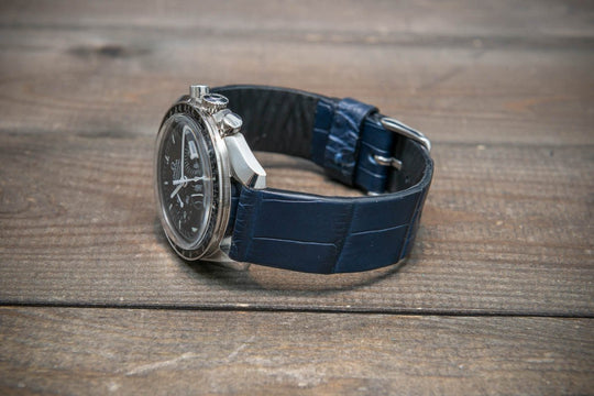 A handmade genuine alligator leather watch strap is made to the highest standard. Blue matte leather color.