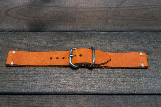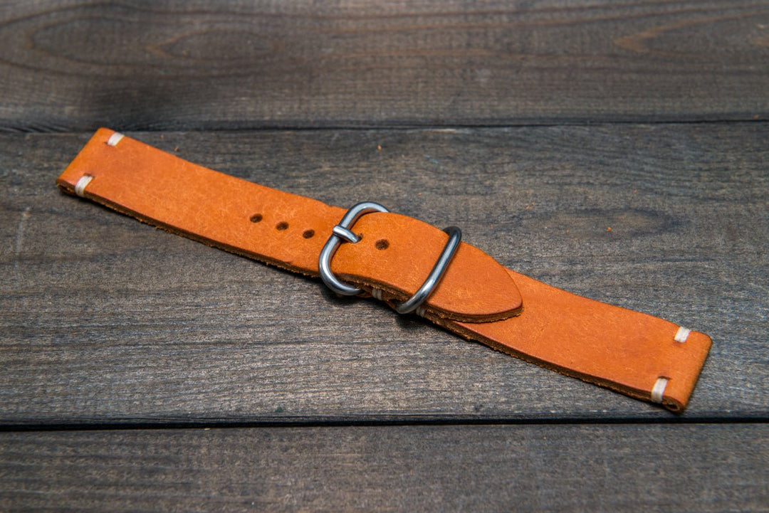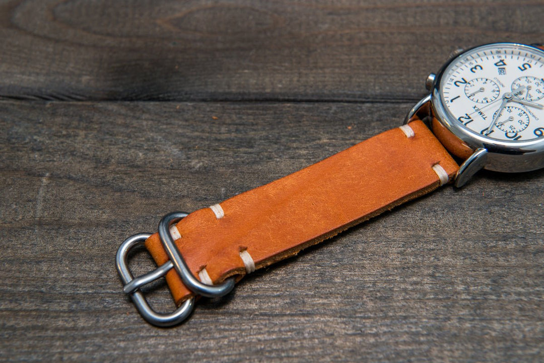 The strap is made with vegetable tanned leather, that is full grain, has a nice supple feel and slightly firm.