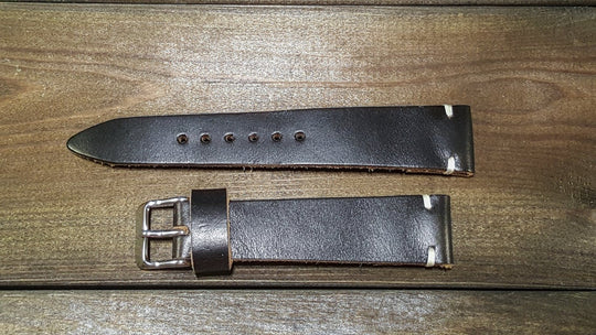 Horween Chromexcel is the original pull-up leather; using time honored techniques and formulas that were developed nearly 100 years ago. Chromexcel is still produced in the United States using a bark retannage from a proprietary recipe, and then genuine hot stuffed with secret blend of natural oils and greases. Chromexcel is characterized by a rich pull-up in full aniline, hand rubbed finishes. Made to this day with old world craftsmanship, modern Chromexcel carries on a long history of superior comfort and durability. We use a durable waxed thread to stitch together the strap, and add a polished stainless steel buckle to complete the band. (For more information about Horween Leathers, please visit horween.com)