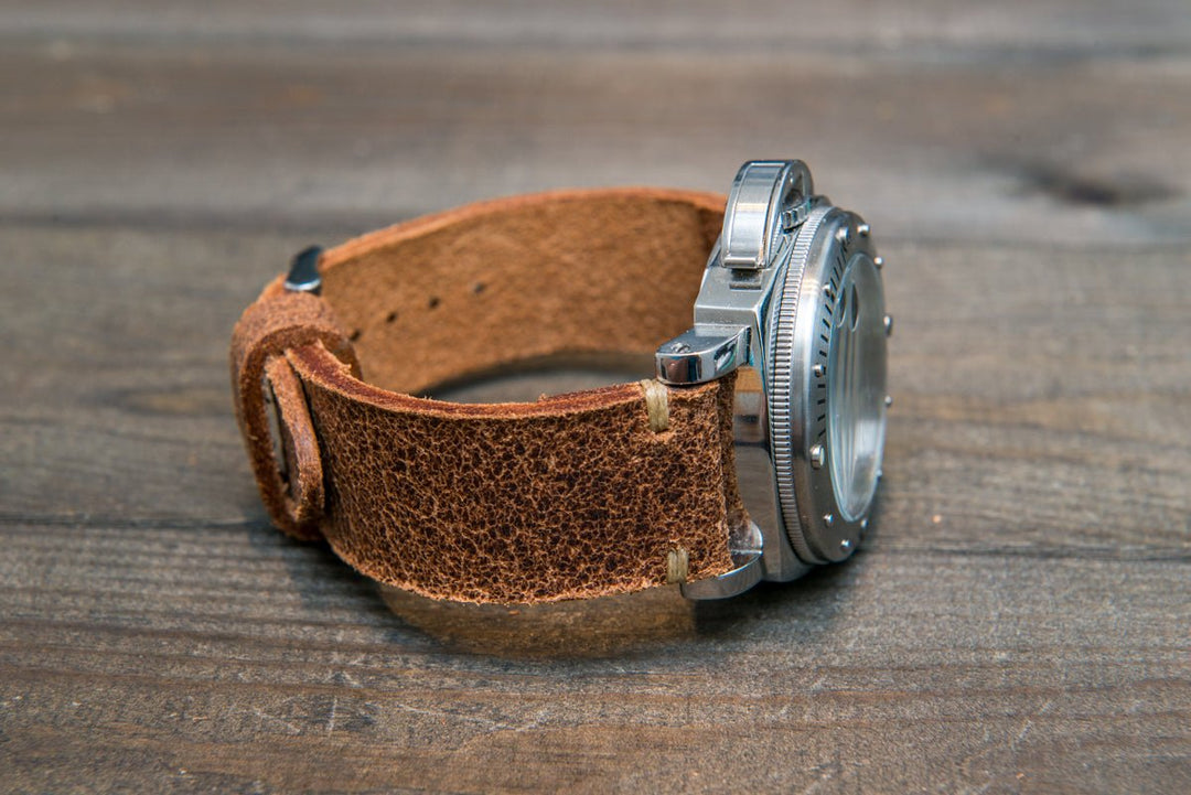 Italian leather watch band, vintage leather watch strap. Cognac (Oily collection). The leather is 3,5 - 4 mm thick and non-stretchy, fits perfectly large and heavy watches. The strap is supple and soft and does not take long to fit in the wrist perfectly.