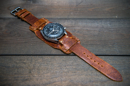 Bund-style Leather Watch Strap, Aviator model, Crazy Cow Cognac