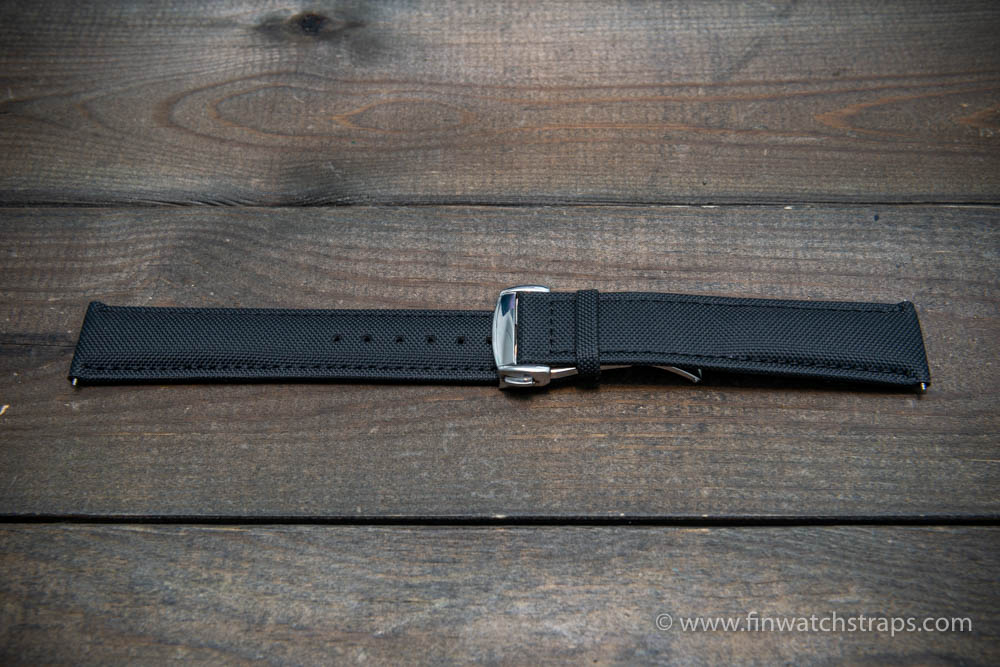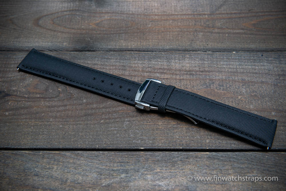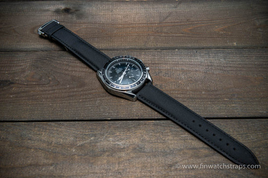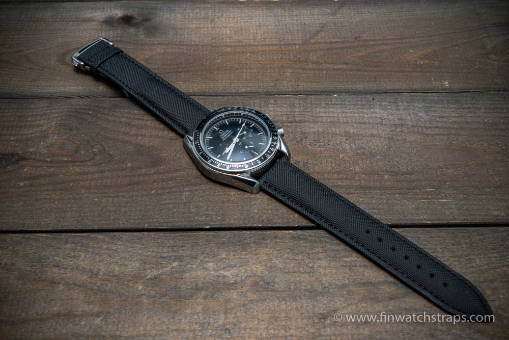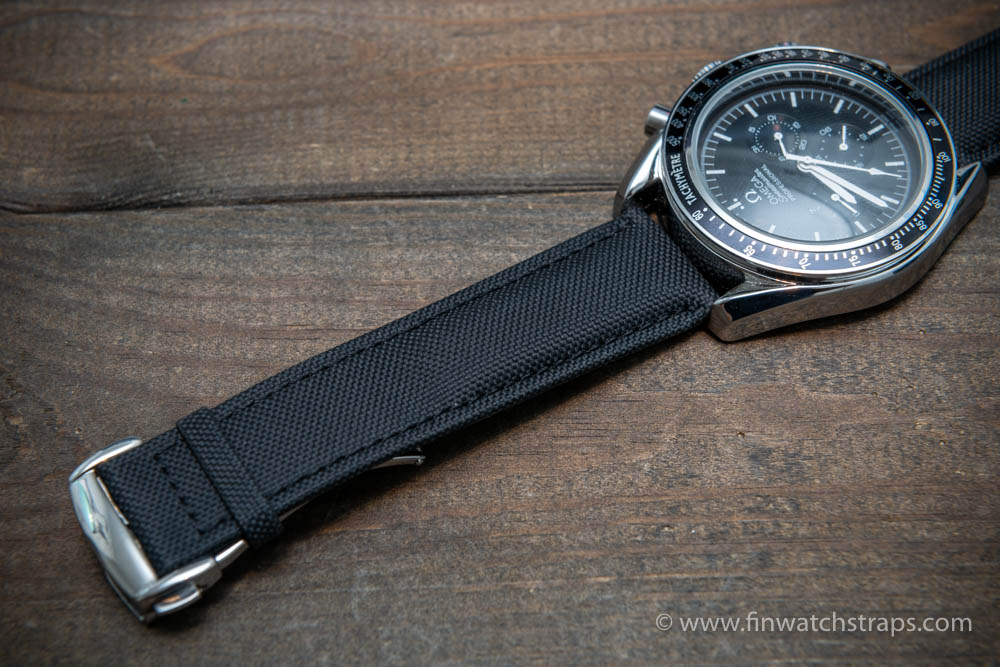 Canvas watch strap for Omega watch, black. Fits perfectly Omega watches, crafted using durable canvas and leather lining.