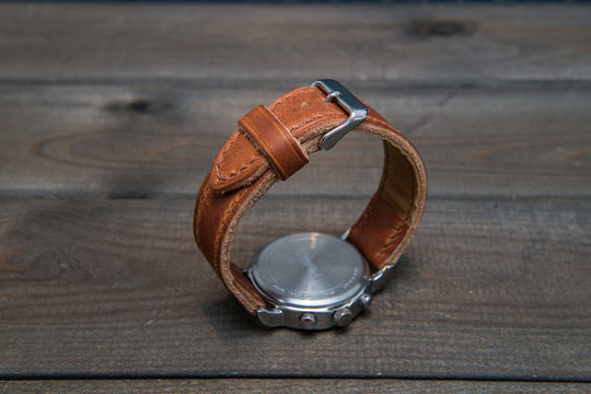 Derby English Tan leather watch strap, hand stitched with French lin waxed thread, which adds durability and style to the watch band premium look. Watch band edges can be dyed on request with different colors.