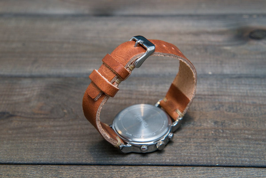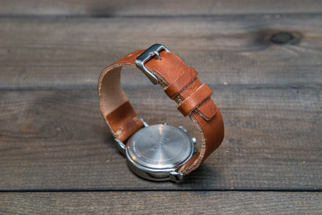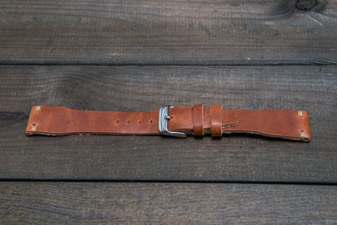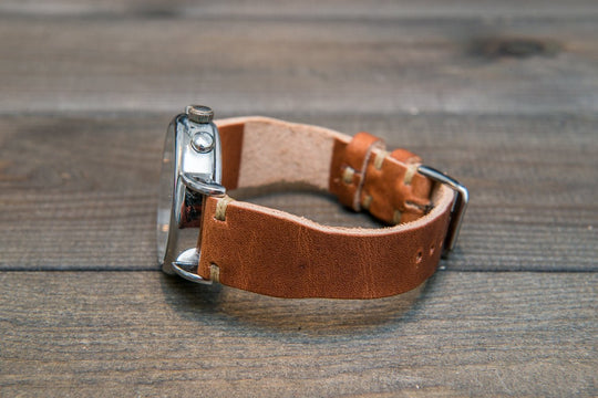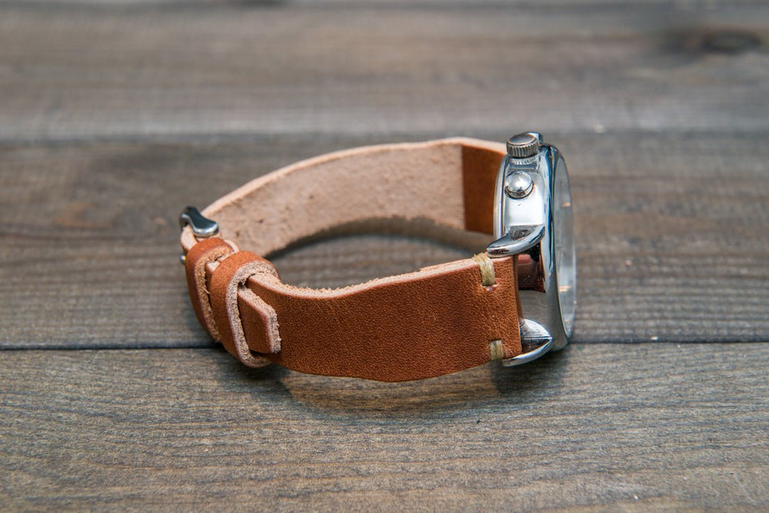 Horween Derby English Tan leather watch strap, Handmade in Finland. The sample is stitched with Olive thread color. Feel free to customize it with the best matching watch thread color.