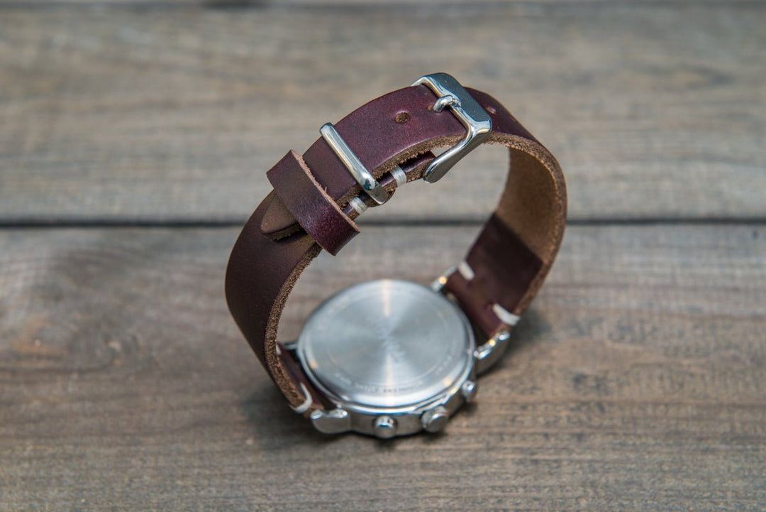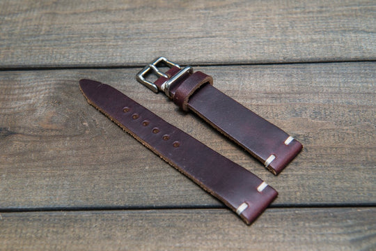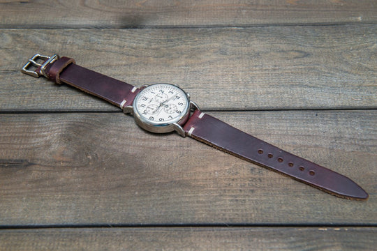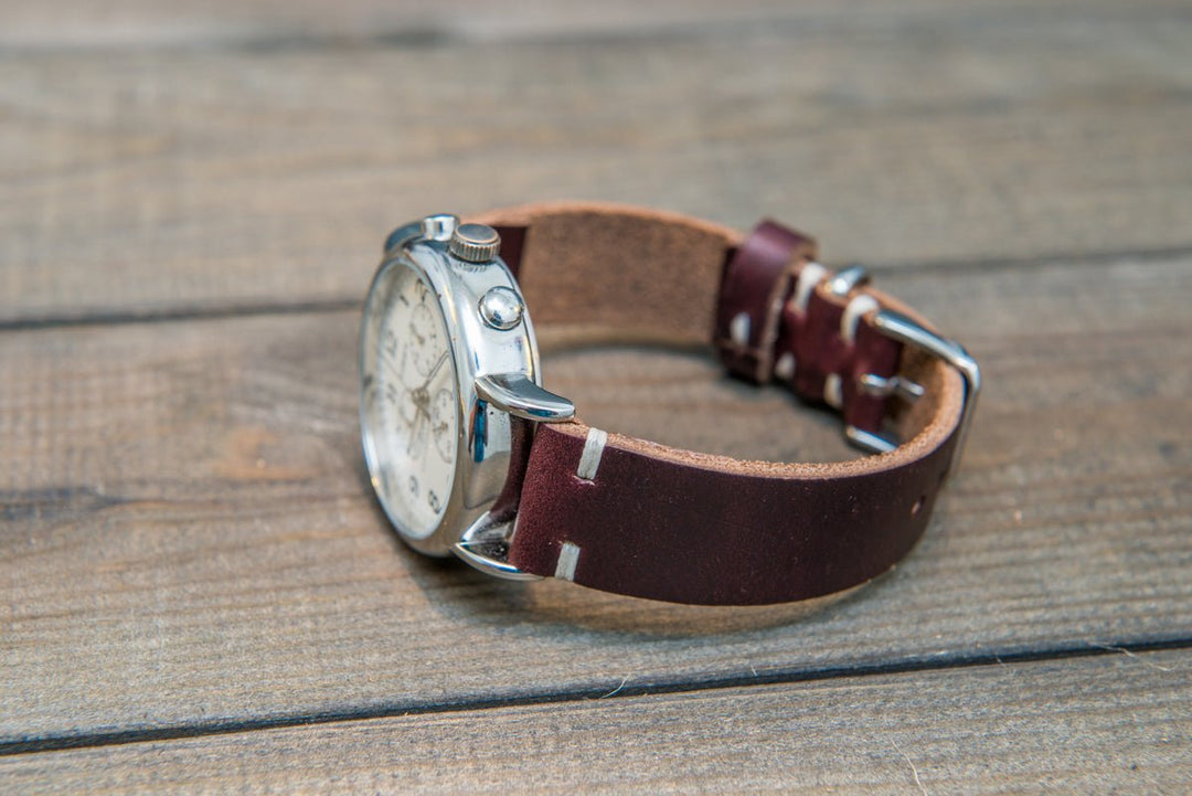 Leather watch strap, Horween Burgundy Chromexcel no. 8 leather watch band. Handmade in Finland. Sizing: 26-22mm, 25-22 mm, 24-20 mm, 23-20 mm, 22-18 mm, 22-20 mm, 20-16 mm, 20-18 mm, 19-16 mm.