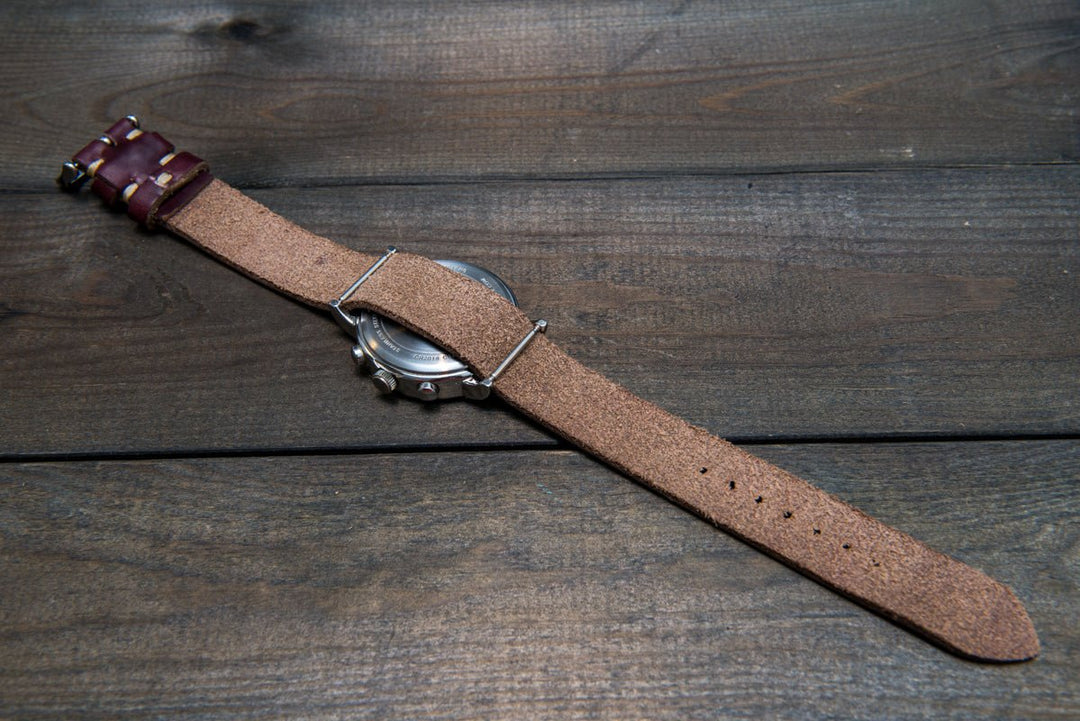 Horween Burgundy/ Chromexcel no.8 leather watch band, one piece vintage leather watch strap. This strap model fits perfectly old vintage style watches and watches with non-removable pins.