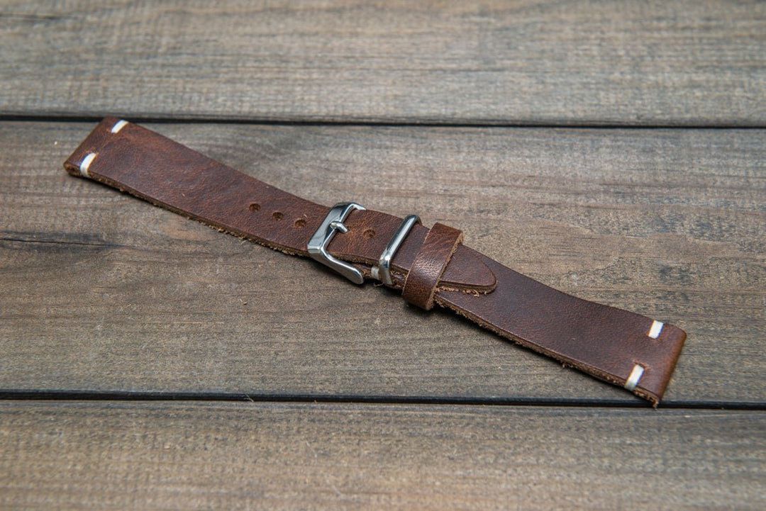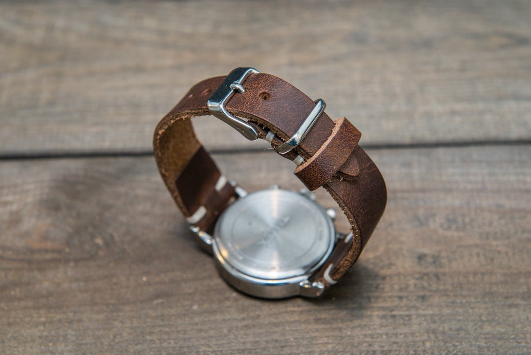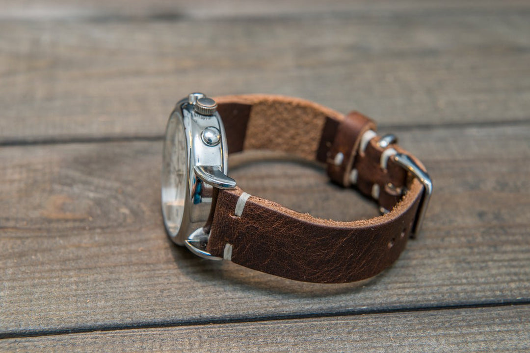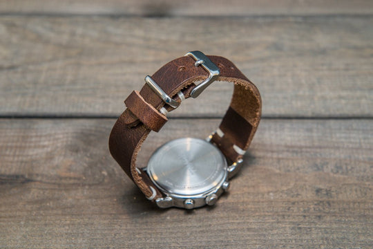 Derby Nut brown leather watch band, handmade in Finland. Tapered size: 26/22mm, 25/22 mm, 24/20mm, 23/20 mm, 22/18 mm, 21/18 mm, 20/16 mm, 19/16 mm