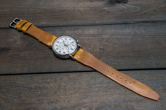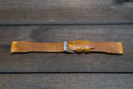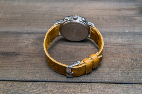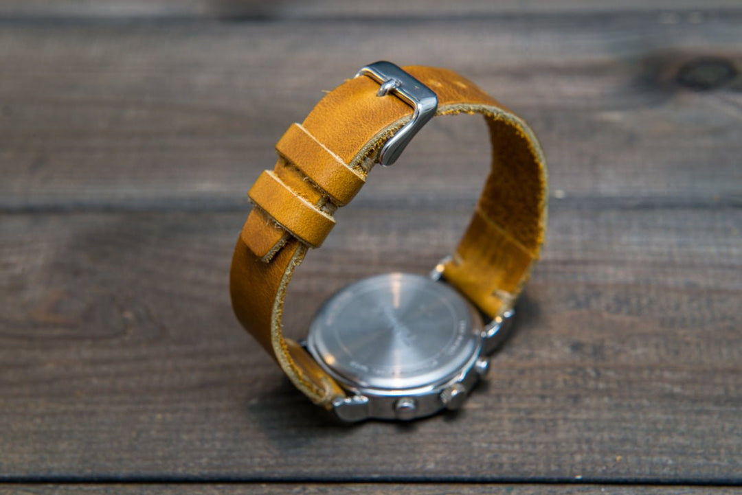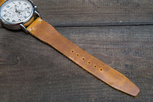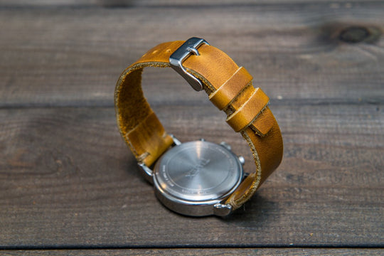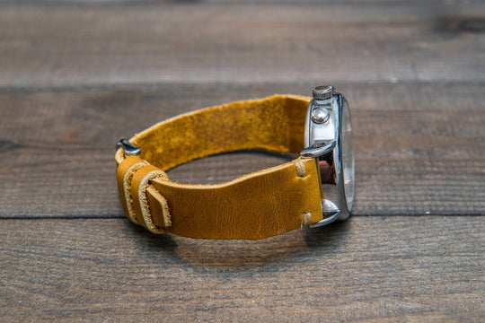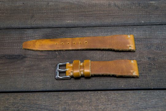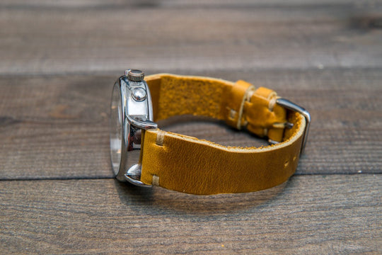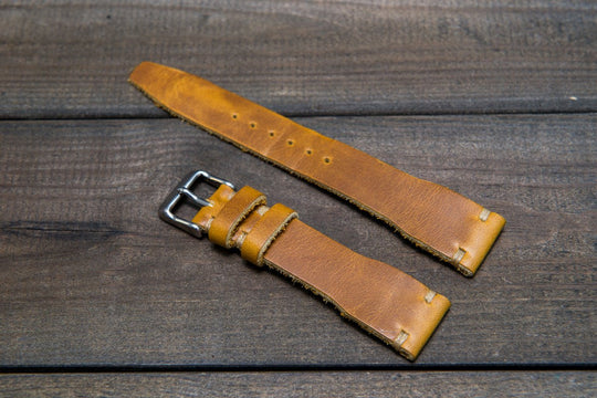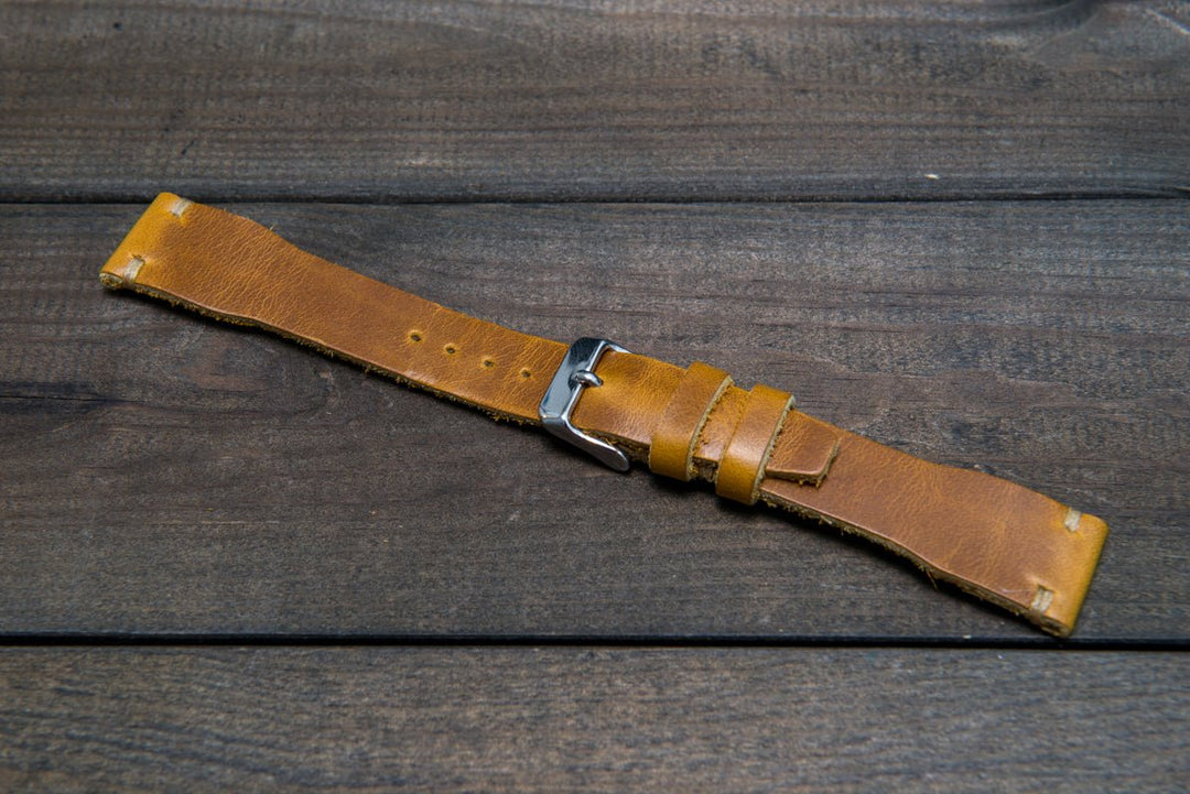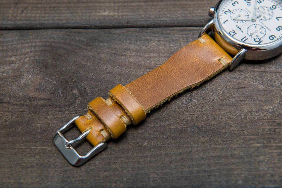 Horween SunGold Cavalier leather watch strap, Handmade in Finland. The sample is stitched with Olive thread color. Feel free to customize it with the best matching watch thread color.