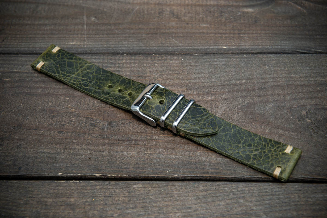 The watch strap is made of the finest Badalassi Carlo leather from Italy. The watch strap has a unique rustic look and deep color. The leather gets beautiful patina with the time. Color: Oliva, pull-up.