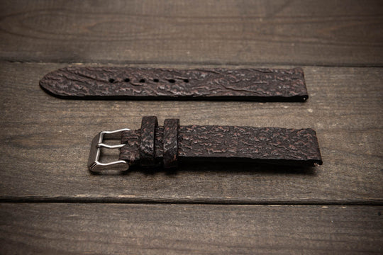 The Crimson Depth strap is made from genuine shark leather, a rare and exceptionally strong material with a highly distinctive surface pattern. The deep reddish-brown tone is the natural color of the hide, giving each strap a unique appearance — no two are exactly alike.