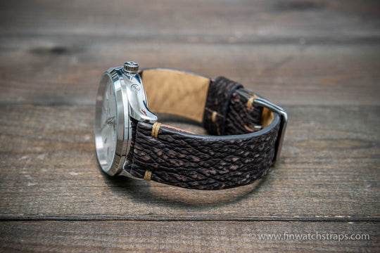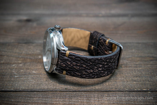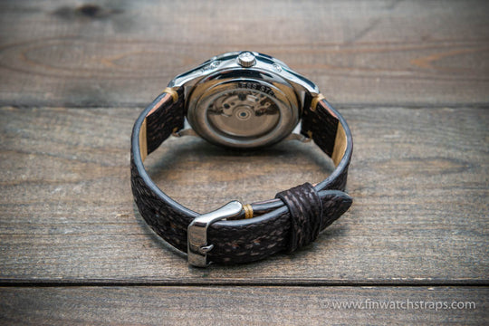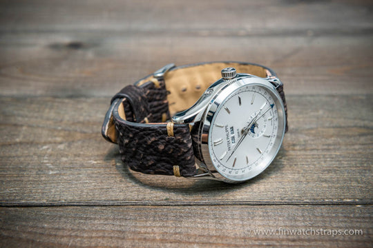 Beautiful and unique dark brown matte shark leather watch strap. The leather for the strap production is sourced from Italy, all certificates are available. The leather is processed with metal-free processing technique, which makes the leather safe for the watch straps use.