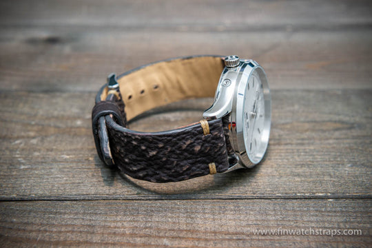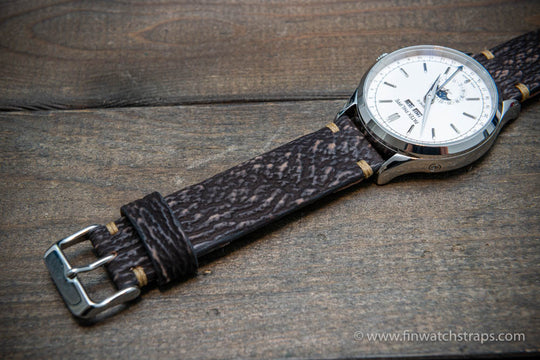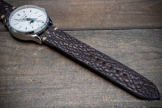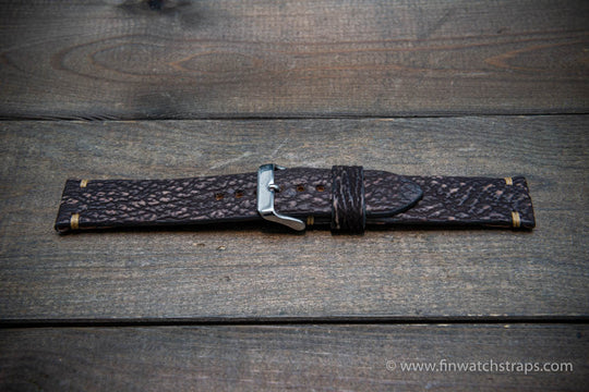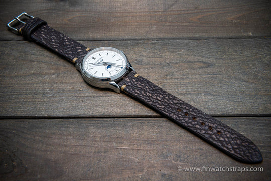 Shark leather is world known for its rough, course texture. Leather watch bands made of shark skin absorb significantly less water than traditional leather straps. This strap is entirely handmade.