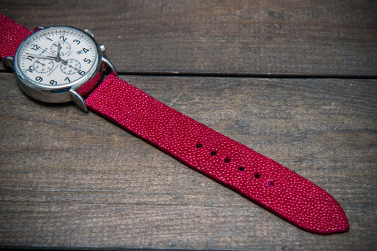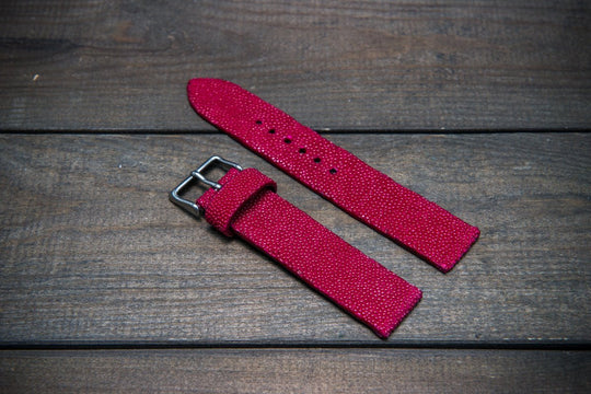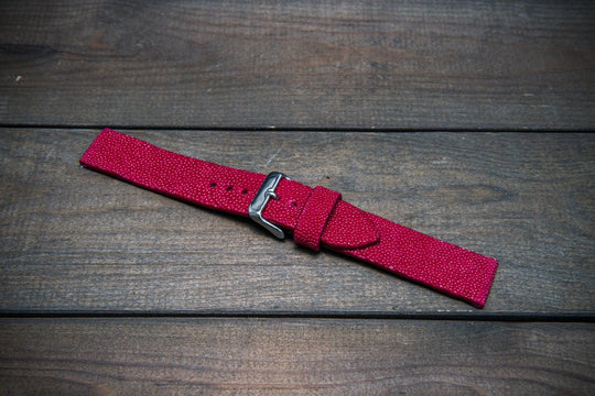 Beautiful and unique genuine stingray leather watch strap (bright funchia color). The stingray leather for the strap production is sourced from Italy, all certificates are available. The leather is processed with metal-free processing technique, which makes the leather safe for the watch straps use.